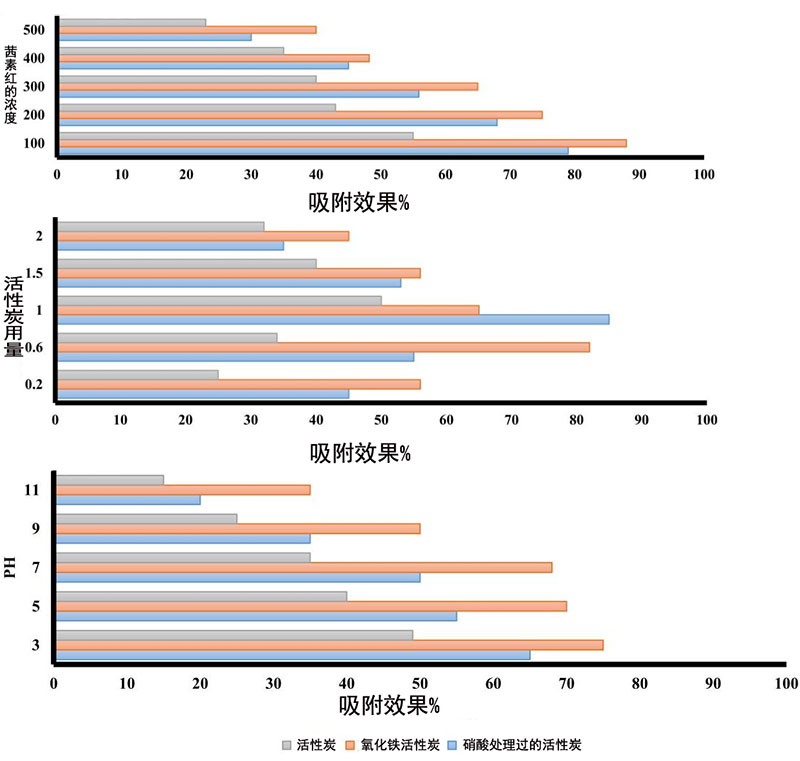 活性炭對茜素紅的吸附,本期我們使用三種類型的活性炭吸附劑來對茜素紅進行吸附實驗,經(jīng)處理的活性炭和氧化鐵活性炭納米復合材料。吸附實驗在分批條件下進行。氧化鐵活性炭的pH值是6.7。其結果是,越低于pH值零電荷點越低,pH顯示酸性時,氧化鐵活性炭對茜素紅的吸附是良好的。后面的吸附數(shù)據(jù)在我們實驗中來呈現(xiàn)。