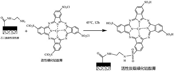 活性炭本身的孔隙結構發達,擁有大的比表面積和高吸收率與穩定性。然而,活性炭按平常的方法浸漬磺化酞菁鈷催化劑會存在負載型催化劑的活性成分損失的問題,導致再利用性能不令人滿意。因此,應通過化學接枝方法在活性炭上載入CoPcS。