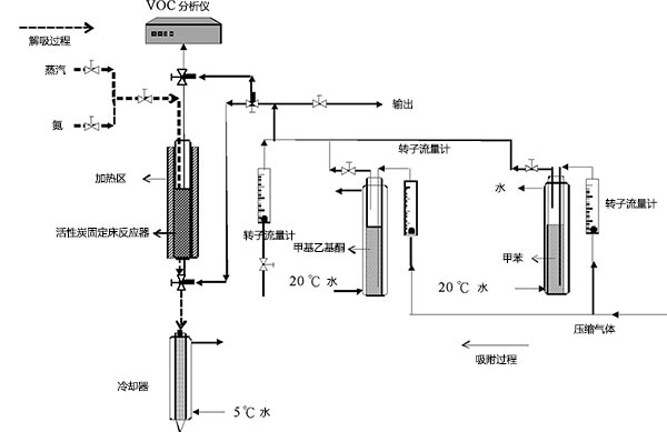 連續交流吸附解吸試驗的實驗裝置如圖1所示。活性炭固定床反應器的直徑為2.72厘米,長度為30厘米。吸附條件是空氣中MEK=4000ppm,氣體速度=0.3米/秒,吸附溫度30℃,相對濕度(RH)<10%。將活性炭在烘箱(140-150℃,4小時)中烘烤后,將其取出并置于干燥盤中冷卻。稱量所需的活性炭并置于固定床反應器中進行吸附試驗。將恒定流速的壓縮空氣注入含有有機溶劑(MEK或甲苯)的氣泡瓶(保持在20℃)中。通過調節轉子流量計來控制單一(4000ppm MEK或4000ppm甲苯)或二元(2000ppm MEK+2000ppm甲苯)蒸氣的濃度。然后將氣體引入反應器中進行實驗測試(保持在30℃)。繼續進行實驗測試直至吸附劑達到飽和,其定義為出口VOC濃度達到入口濃度的95%的時間。使用VOC分析儀測量氣流中的蒸氣濃度。然后將活性炭從反應器中取出并稱重用于計算飽和MEK吸附容量。