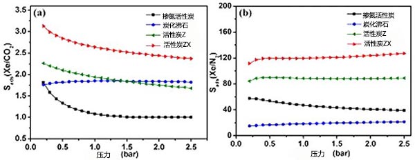 圖4、幾種活性炭樣品吸附選擇性分別為(a)Xe/CO 2,(b)Xe/N 2,摩爾分數(shù)y CO2=0.99,y N2=0.99。
