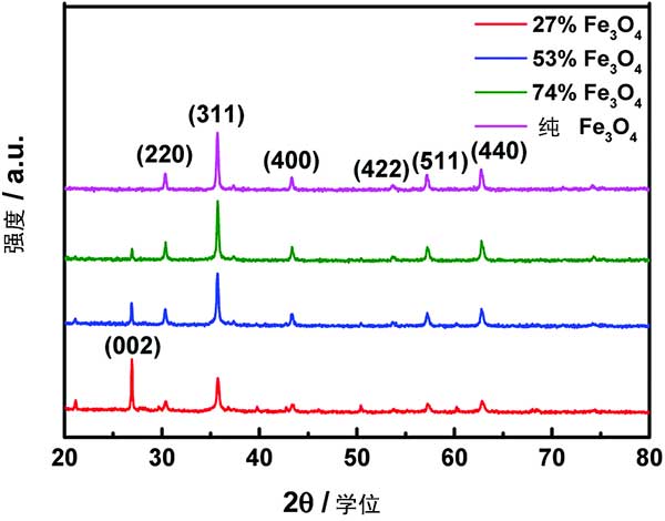 使用XRD衍射儀測量活性炭復合物的晶體結構。圖1顯示了所制備樣品的衍射圖案。在2的特征衍射峰θ= 31.24°,36.82°,44.76°,55.62°,59.30°和65.19°的與(220),(311),(400),(422),(511)和(440)Fe 3 O 4平面一致。此外,在約2峰值θ=26.20°被分配給蓬松結構化活性炭。觀察到Fe 3 O 4衍射峰的強度隨著Fe 3 O 4納米顆粒負載量的增加而增強,并且活性炭的強度在相同的過程中減少。上述現象表明Fe 3 O 4納米顆粒可以成功地引入蓬松結構的活性炭上。