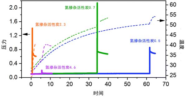 圖2: 不同質量的氮摻雜活性炭機械化學合成的溫度(虛線)和壓力(實線)曲線。
