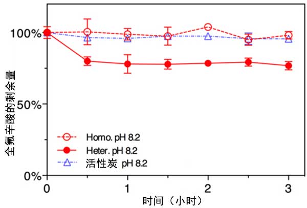 在存在和不存在活性炭的情況下,在密封的40mL燒瓶中在酸性,中性和堿性pH條件下進行全氟辛酸與S 2 O 8的反應,反應溫度為80℃,用恒溫水浴保持。對于大多數實驗,初始全氟辛酸濃度為0.5μM,活性炭濃度為200 mg/L,500 mg/L或1000 mg/L。對于酸性和堿性條件實驗,使用濃硫酸或150mM氫氧化鈉溶液將pH值調節至1.0或13.0。對于在pH 8.2下進行的實驗,使用100mM硼酸鹽作為緩沖液(NaB(OH)4/H 3 BO 4)。在所有實驗中包括五個重復。