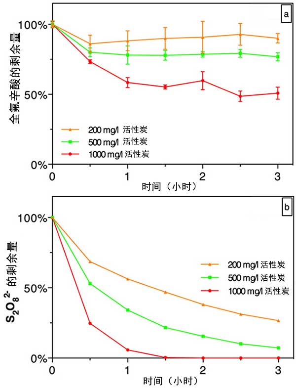 圖2。活性炭濃度對化學吸附去除全氟辛酸(圖2a)和過硫酸鹽分解(圖2b)的影響。