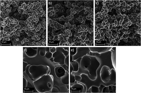 通過掃描電子顯微鏡對高比表面積活性炭進行表征于圖2a-c中。可以看出的是這幾種活性炭具有它是由球形碳顆粒的尺寸與周圍3μm的孔隙網絡結構,這是典型的基于甲醛樹脂活性炭。球形活性炭納米顆粒的燒結導致孔隙網絡內的空腔,其在直徑為2至20μm的形成。活性炭表面是光滑的,沒有燒結的球形活性炭納米顆粒,而它們仍然在網絡內具有相似直徑的空腔。由于在化學活化之前低的預碳化溫度,球形納米顆粒在活化過程中強烈聚集,這導致如前所述的較不剛性的孔隙網絡。