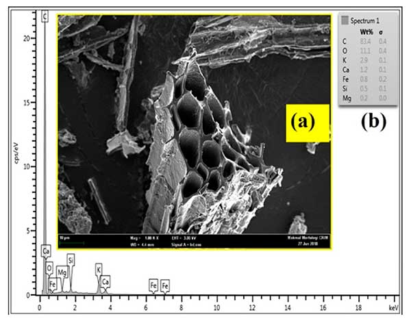 FESEM和EDX如圖2所示。FESEM用于研究活性炭的表面形態。孔徑分布與孔隙大小具有相同的附屬關系,如圖2a,b所示。在顯微照片圖像中指出,圓柱狀管構成所制備的活性炭的孔結構。由黃麻和椰子纖維制成的活性炭反映了同樣的趨勢。此外,揭示了通過活化劑能在纖維表面上具有良好構建和發展孔隙與高表面積。