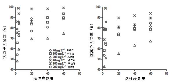圖2:活性炭對(duì)Ca 2+離子和Mg 2+離子吸附效率。