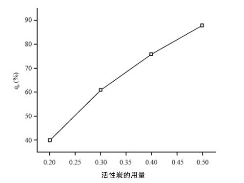 吸附劑劑量的影響:使用給定的前者初始濃度和pH,作為活性炭負載的函數吸附的酚紅染料的百分比(w/w)的圖示于圖5中。在其研究范圍內,隨著活性炭負荷的增加,染料的吸附增加。這可能是因為在增加活性炭負載,它的表面面積,因而活性位點/吸附物(染料)分子的可用性增加。