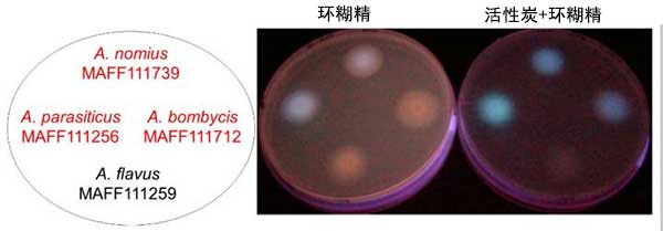 黃曲霉素本身也可以被檢測到,因為它們在紫外光下會發出熒光。但是,這種方法并不常用,因為紫外光無法檢測到少量的AFS。使用活性炭和環糊精共同處理的改良添加方法可提高AFS衍生熒光的可見度(圖1)。改善的可見性可歸因于活性炭添加減少了來自培養板表面的紫外光的反射和散射的情況。此外,活性炭添加可刺激AFS產生,從而增加AFS熒光并改善其可見度。然而,活性炭添加影響AFS產生的機制仍然不清楚,對產量增加的具體特征也是如此。用于該方法的活性炭產品具有不同的特性(表1)。這可能對該方法的再現性產生不利影響。