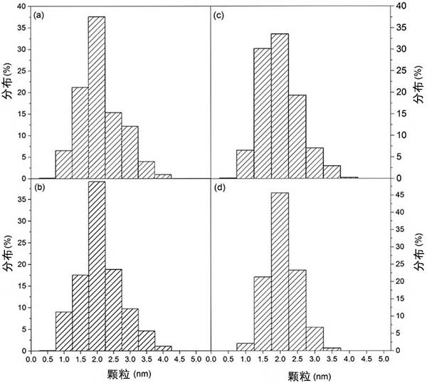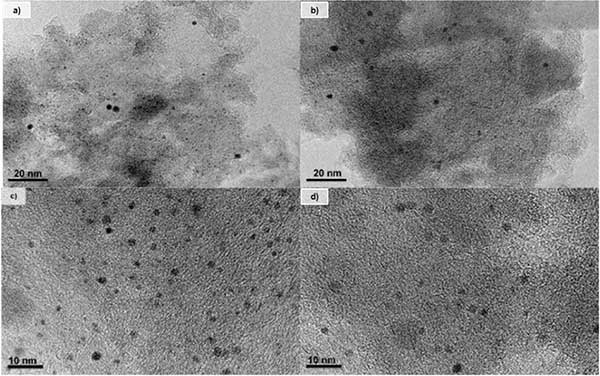 所有活性炭催化劑都顯示出高BET表面積。在二氯甲烷加氫脫氯中使用后沒有觀察到顯著差異,這消除了碳質(zhì)沉積物阻塞多孔結(jié)構(gòu)作為催化劑失活的原因。CO化學(xué)吸附結(jié)果表明,鉑在所有活性炭催化劑中均勻分散,它們之間略有不同。高Pt分散可歸因于活性炭的高表面積及其表面化學(xué)性質(zhì),這在催化劑制備過程中引起活性相與載體之間的相互作用。TEM圖像(圖1)和金屬粒度分布(圖2)證實了在鉑在兩種不同活性炭中形成Pt納米顆粒,平均尺寸值分別為1.6和2.0nm。