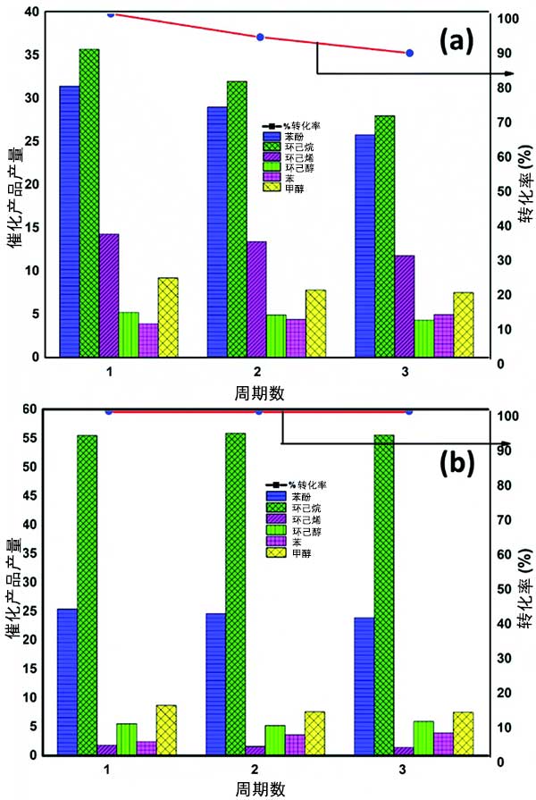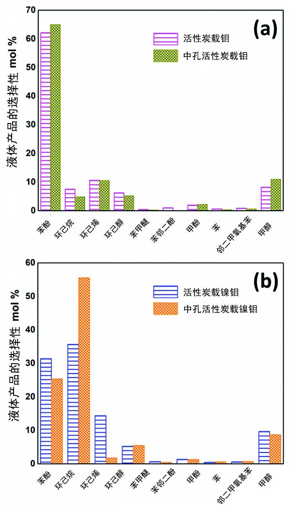 圖1:(a)活性炭載二硫化鉬催化劑(b)活性炭載鎳催化劑用于轉(zhuǎn)化愈創(chuàng)木酚的液體產(chǎn)物選擇性和轉(zhuǎn)換后的比較。