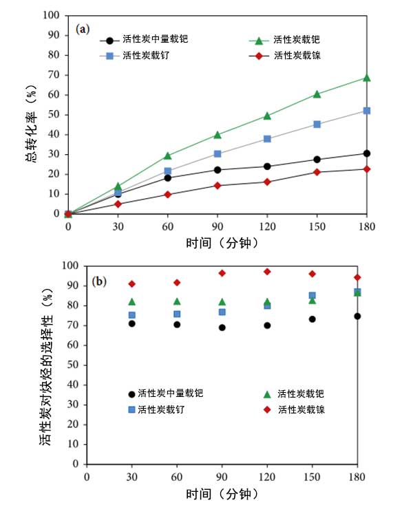 活性炭催化劑對炔烴的選擇性氫化的催化性能如圖3所示,炔烴總轉化率(%)和對炔烴的選擇性。所有活性炭載金屬催化劑在炔烴的氫化過程中都是活性的,并且對炔烴(所需產物)具有高選擇性。
