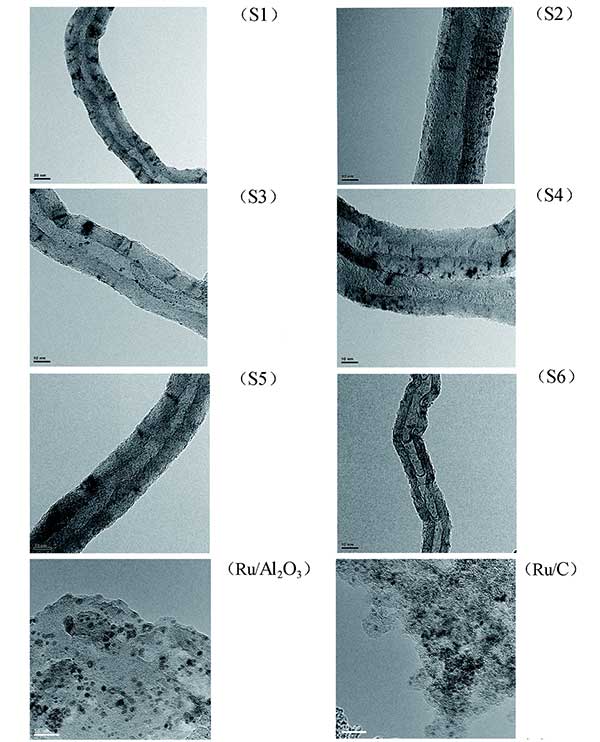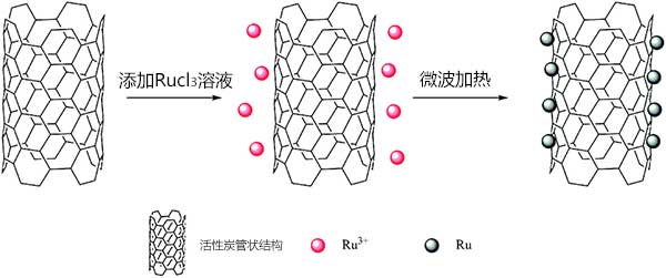 所有載釕活性炭上的釕負(fù)載量理論上為5%。通常,將活性炭加入120mL乙二醇中。并將混合物在超聲處理30分鐘以確保活性炭均勻分散。超聲處理后,在連續(xù)攪拌下滴加3.0mL RuCl 3水溶液30分鐘。然后是使用NaOH乙二醇溶液將混合物的pH調(diào)節(jié)至4.0。然后,在連續(xù)攪拌24小時(shí)后,將溶液放入微波合成反應(yīng)器中加熱100秒。過(guò)濾混合物溶液,用去離子水洗滌直至濾液的pH達(dá)到7.0,并在80℃下真空干燥。將樣品研磨成粉末使用。由于活性炭的表面是疏水的,它們傾向于在極性溶劑中聚集。并且由官能團(tuán)改性的活性炭可以提供足夠的孔隙以使釕納米顆粒均勻地分布在活性炭的表面上。在通過(guò)微波加熱的多元醇方法制備活性炭負(fù)載的釕納米顆粒。合成過(guò)程如圖1所示。