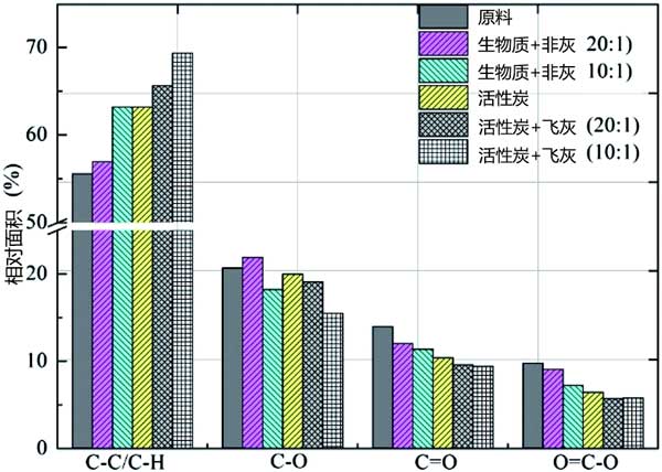 表面基團(tuán)的芳香族C-C或C-H隨著活性炭原料在熱解時(shí)的比例增加以及氣體活化而增加可以從圖2中可以看出。這是預(yù)期的,在不完全燃燒和部分氧化可導(dǎo)致在含碳材料內(nèi)形成芳族化合物。含氧官能團(tuán)如C-O,C=O和O.=隨著生物炭和活性炭的煤飛灰比例增加,C-O的相對(duì)面積減小。煤飛灰似乎提高了芳構(gòu)化程度,但顯著降低了羰基的相對(duì)濃度,同時(shí)保持或適度降低了酮和羧酸的性質(zhì)。這可能涉及先前發(fā)現(xiàn)的用于生物質(zhì)和煤飛灰的共熱解的生物燃料的增強(qiáng)的脫氧,并且表明活性炭的表面化學(xué)可以使用煤飛灰作為添加劑來介導(dǎo)。