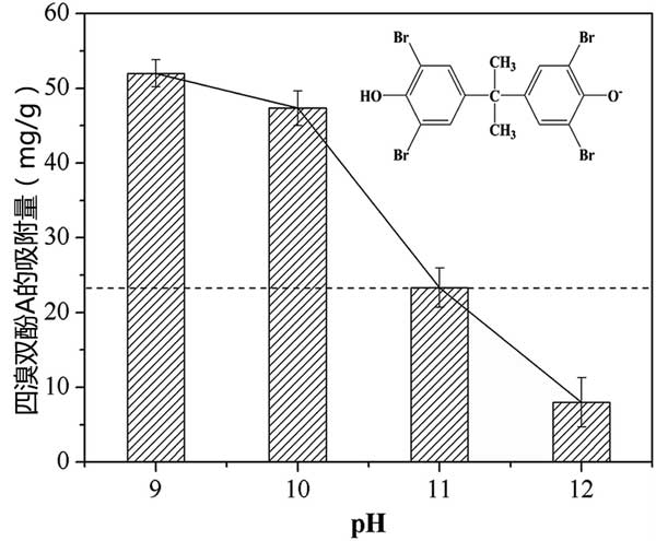 圖2:初始pH對(duì)用活性炭吸附四溴雙酚A的影響。