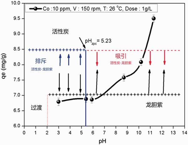 溶液的pH在吸附過程中起重要作用,特別是在吸收能力方面。據觀察,隨著pH值的增加,龍膽紫去除率一直在增加(圖4)。pH值對活性炭吸附龍膽紫的影響可以在pH pzc=5.23的基礎上解釋。活性炭表面電荷在pH pzc以上為負。因此,隨著溶液的pH增加,帶正電荷的位點的數量減少并且有利于通過靜電吸引的龍膽紫吸附。龍膽紫的吸附容量隨時間增加,在30分鐘后達到最大值,然后傾向于恒定值,表明活性炭不再從溶液中除去龍膽紫離子。