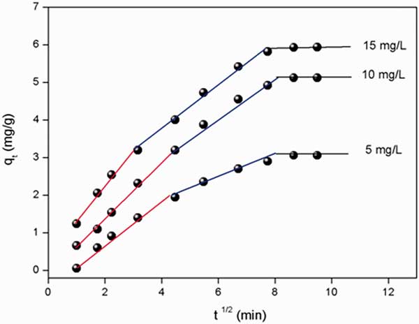 圖2:龍膽紫染料吸附到活性炭上的顆粒內擴散模型。