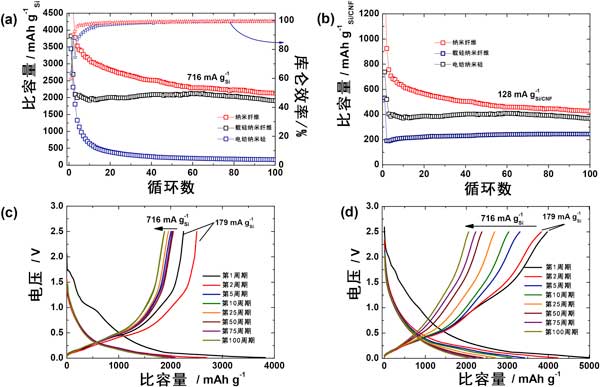 如圖4所示,從第一個循環的電壓分布中看出,兩個陽極的第一個循環的額外貢獻來自不可逆的固體電解質界面層形成和電解質分解。對于電化學表征,在紐扣電池配置中使用鋰金屬作為對電極對所有硅陽極進行恒電流充電和放電。裸露的十億分之一硅陽極在第一個循環中提供3445mAhg的放電容量,庫侖效率約為65%。從第二個循環開始,二氧化硅的硅載納米纖維陰極的比容量值急劇下降至2600mAhg,而納米纖維的靜電紡絲陽極顯示出邊際下降,比容量為4000mAhg-1,庫侖效率均為約91%。比容量的急劇下降可歸因于二氧化硅的硅載納米纖維中的二氧化硅殼在第一次循環中不可逆鋰化。
