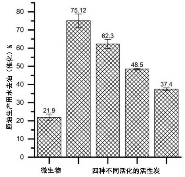 簡而言之,使用活性炭(60%-93%)和載微生物活性炭(16%-84%)比游離的無活性炭載體的微生物(1%-47%)更好地去除芳香烴。材料的孔隙率和吸附偶極性有利于吸附。常規(guī)活性炭表現(xiàn)出高度的微孔性,其中可以容納分子量約為100的苯,甲苯和苯酚。活性炭的非極性特征保證了碳?xì)浠衔锏氖杷Γ彩欠菢O性的。活性炭陽離子表面有利于芳烴保留,因?yàn)榉辑h(huán)中的π電子與表面陽離子靜電連接。使用常規(guī)活性炭和載微生物活性炭的原油去除能力如圖3所示。使用游離的微生物和油-鹽水乳液作為對(duì)照。
