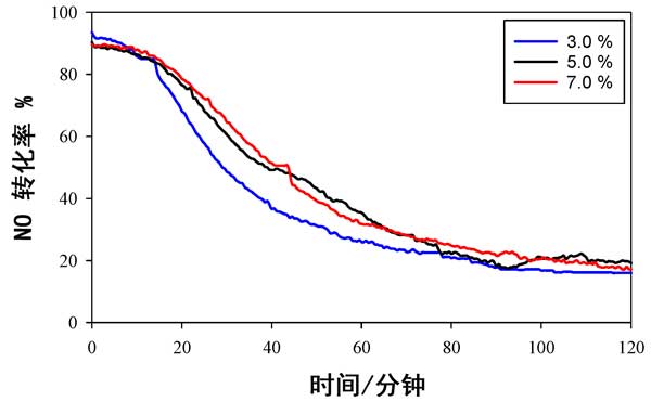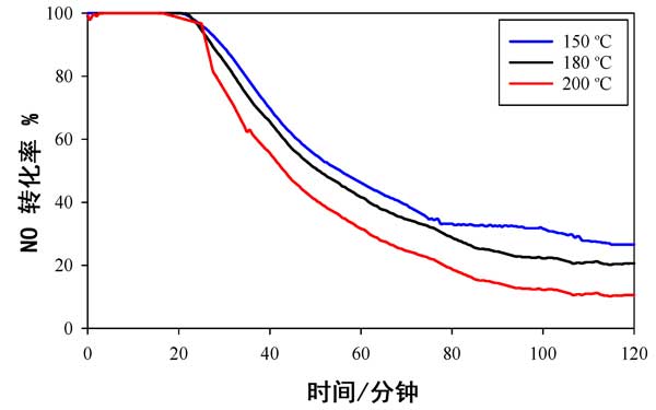 使用活性炭載錳氧化物催化劑時(shí),不同溫度下NO轉(zhuǎn)化率數(shù)據(jù)與時(shí)間的關(guān)系如圖2所示。它用于提供可以與以前發(fā)布的數(shù)據(jù)進(jìn)行比較的基線(xiàn)數(shù)據(jù)。在所有溫度(150°C,180°C和200°C)的前20分鐘內(nèi),幾乎有100%的NO轉(zhuǎn)化發(fā)生,但在此初始階段后NO轉(zhuǎn)化迅速下降,并且在2小時(shí)的測(cè)試后,轉(zhuǎn)化率不足20%;钚缘臏囟纫缽男砸来螢150°C>180°C>200°C。