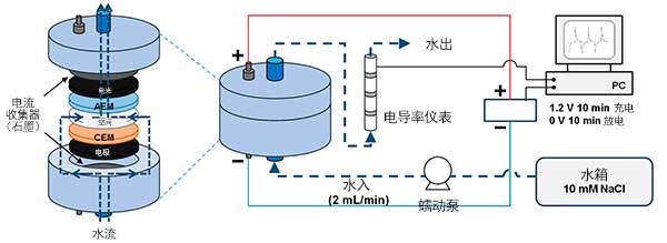 方案1中描述了用于檢查脫鹽性能的膜電容去離子系統(tǒng)。每個電極由作為集電器的石墨,交流電極和IEM組成。將陰離子交換膜和陽離子交換膜分別放在陽極和陰極上。一對電極由厚度為110 µm的尼龍墊片隔開。使用蠕動泵將進料水供應(yīng)到電解池。處理后的溶液直接流過電導(dǎo)率儀,隨后使用單程模式。除了IEM的存在外,還以與電容去離子中使用的相同配置進行了CDI實驗。使用電池循環(huán)器在1點分別施加電壓10分鐘。在充電步驟中為2 V,在放電步驟中為0V。從第三個循環(huán)獲得數(shù)據(jù),并從至少三個操作中計算出平均值,以實現(xiàn)可重復(fù)性。