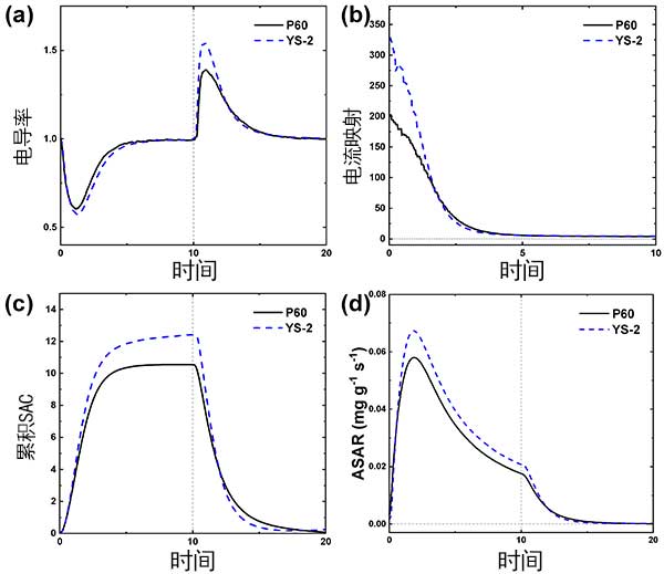 圖2以(a)歸一化電導(dǎo)率曲線表示使用疏水和親水活性炭電極的電容去離子性能。如圖2a所示,在充電步驟期間,與疏水活性炭電極相比,歸一化電導(dǎo)率在親水活性炭電極的情況下顯示出更低和更寬的下降。對于親水活性炭電極,在充電步驟開始時,圖2b中所示的特定電流也顯得較高。圖2的a,b在電容去離子表明更多離子在充電步驟中的初始幾分鐘吸附在親水活性炭電極的表面上。這意味著在親水活性炭電極上可以更快,更高地吸附鹽。可以推斷,由于水分子更容易進入微孔,因此親水活性炭電極上離子的可及表面積大于疏水活性炭電極上的離子的可及表面積。
