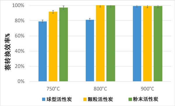 圖2:用活性炭球型、顆粒和粉末在750°C,800°C,900°C下獲得的萘轉化率以百分比表示,并帶有標準偏差的表示。