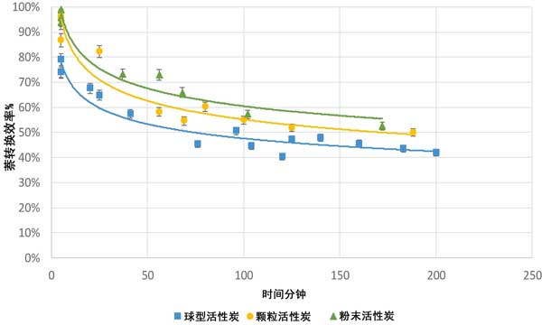 圖3報告了在測試過程中三種粒徑的活性炭萘轉化的時間演變,表明轉化效率的連續降低與有效表面積的逐漸減小有關。結果用誤差條表示,表明標準偏差,表明活性炭顆粒和粉末的行為相當相似,而活性炭顆粒始終顯示出較低的轉化效率,達到10%或更高。這表明較小的顆粒意味著降低的擴散阻力。