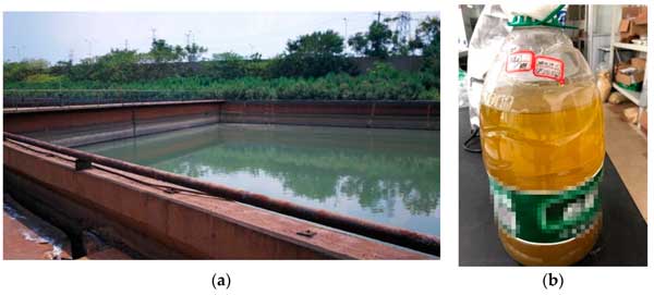 圖1:采樣地點和廢水樣本。(a)污水處理池;(b)未經處理的廢水樣品。