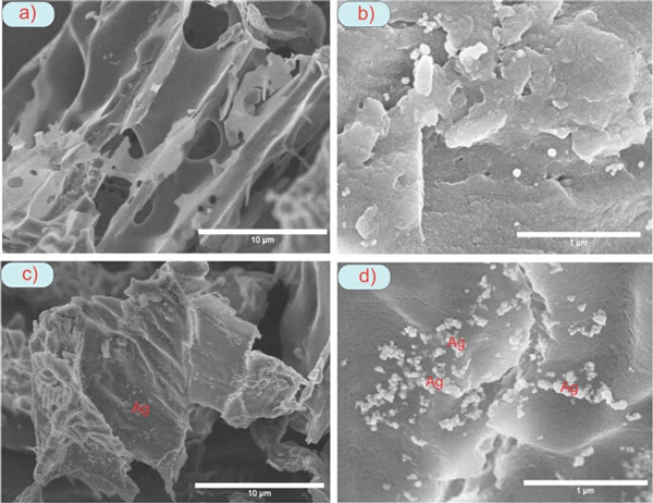 圖2:(a,b)活性炭和(c,d)載銀活性炭的SEM圖像。