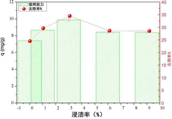 為了評估各種浸漬率對改性活性炭的磷酸鹽吸附能力的影響,在不同的納米銀顆粒/活性炭質量比(1%,3.0%,6.0%和9.0%)下,以原始活性炭和負載納米銀顆粒的活性炭進行了初步實驗。 。在這項研究中,實驗是在25±2°C的溫度下,初始磷酸鹽濃度為30 mg/L,吸附時間為60分鐘,吸附劑量為1.2 g / L進行的。