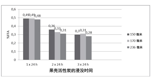 圖1:椰殼活性炭FFA數與粒徑和浸沒時間的關系。