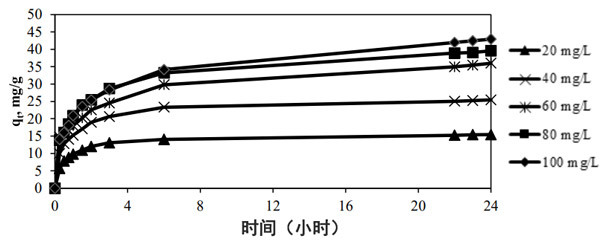 圖2說明了甲基黃初始濃度和接觸時間對30°C時吸附平衡的影響。隨著初始染料濃度從20 mg/L增加到100 mg/L,發現平衡時的染料吸附量增加。這些表明初始濃度提供了必要的驅動力,以克服對染料分子在水相和固相之間傳質的阻力。初始濃度越高,濃度梯度的驅動力越大。從圖中可以看出,較高的初始濃度的染料溶液需要更長的接觸時間才能達到平衡。初始濃度為20-40 mg/L的染料溶液達到平衡所需的接觸時間約為3-5小時。
