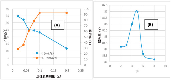 我們研究了不同參數對活性炭去除乙酰胺的影響,例如吸附劑的劑量,pH,乙酰胺的初始濃度和接觸時間。吸附劑的用量是吸附過程中的重要參數,因為它決定了系統中吸附劑與被吸附物的平衡以及給定濃度下吸附劑的容量。吸附劑劑量對由活性炭去除啶蟲脒的效果在不同的吸附劑的劑量從0.02-0.2克/100毫升變化進行了研究,如圖1。隨著活性炭吸附劑劑量的增加,對乙酰胺的去除百分率從27.8%增加到92.5%。這可以歸因于活動站點數量的增加。在較高的吸附劑量下,由于聚集體的形成,吸附位點的使用不完全。與去除百分率相反,隨著吸附劑劑量的增加,活性炭對乙酰胺的吸附能力下降了一些。注意到在0.1g的吸附劑劑量之后,吸附效率沒有顯示出顯著的增加,這表明了吸附位點的飽和。對于通過活性炭去除乙酰胺實驗而言,0.1 g的吸附劑量似乎是合適的。
