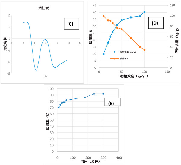 初始濃度為10-100 µg/mL可以提高初始濃度。如圖1D所示,在將乙酰胺的初始濃度從10 mg/L更改為100 mg/L時,吸附容量從9.94 mg/g增加到36.31 mg/g,去除效率從99.37%降低到40.275%。這些結果表明,活性炭對乙酰胺類的吸附取決于初始濃度。