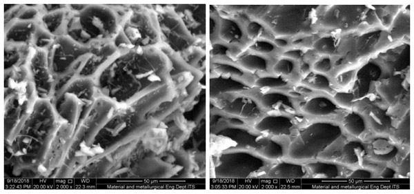 通常,由碳化過程形成的活性炭具有粗糙的表面結(jié)構(gòu),其孔徑不會(huì)太大以至于會(huì)影響吸附能力(圖1)。粒度和表面積對(duì)吸附劑很重要,因?yàn)榱6葧?huì)影響吸附能力。由該圖可知,通過RSS碳化處理得到的活性炭的孔徑為40μm左右,未改性,使用活化液進(jìn)行改性后,為<20μm。這表明,活化液的浸漬在孔的形成中起著重要的作用。促進(jìn)更多的孔隙形成。總表面積影響總吸附容量,從而提高吸附劑去除廢水中有機(jī)化合物的效率。