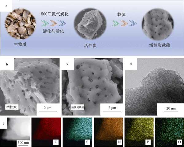 首先,除去生物質(zhì)的污垢和表面雜質(zhì),用清水徹底清洗活性炭原材料,然后用蒸餾水反復(fù)清洗,然后將它們粉碎成碎片,然后在烤箱中100°C下干燥。為了進(jìn)行預(yù)碳化,將干燥的生物質(zhì)在氮?dú)夥障碌恼婵展苁綘t中在500°C的溫度下熱解2小時(shí),以去除少量有機(jī)分子。隨后,為了通過化學(xué)活化提高比表面積,將預(yù)碳酸化的生物質(zhì)以1:4的重量比浸入作為化學(xué)活化劑的水溶液中,然后充分?jǐn)嚢?小時(shí)以確保完全滲透。之后,將混合物在N 2下于900°C退火1小時(shí)。最后,用鹽酸反復(fù)洗滌退火后的樣品,然后用過量的蒸餾水沖洗以獲得中性pH。最終樣品通過在80°C的空氣中干燥獲得,并標(biāo)記為多孔活性炭。相比之下,使用相同步驟制備的未添加活化劑的產(chǎn)品被標(biāo)記為無(wú)孔活性炭。接著使用這兩種活性炭升級(jí)成加硫復(fù)合材料,將升華后的硫(純度>99.95%)和相應(yīng)的活性炭粉末(重量比為60:40)充分混合并在研缽中研磨。然后,將獲得的混合物用特氟隆容器密封在高壓釜中。在155°C下熱處理12小時(shí)后,獲得了多孔摻硫活性炭和無(wú)孔摻硫活性炭復(fù)合材料。