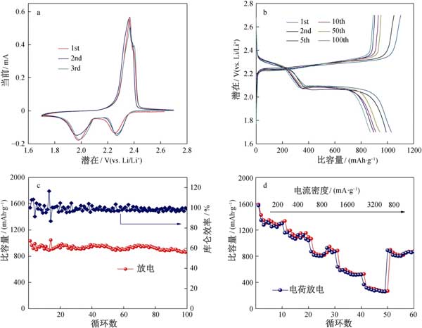 為了評(píng)估活性炭作為陰極的電化學(xué)性能,將鋰箔作為陽(yáng)極組裝到鋰硫電池的紐扣電池中。用于第一,第二和第三個(gè)循環(huán)的循環(huán)伏安圖(CV)曲線上在0.05毫伏·秒的掃描速率的電位窗口進(jìn)行(圖2A)。在第一循環(huán)期間,觀察到兩個(gè)陰極峰在2.26和1.97 V,CV曲線中最初的幾個(gè)循環(huán)幾乎重疊,這表明循環(huán)穩(wěn)定性極佳,容量保持率相對(duì)較高。活性炭的恒電流充電/放電曲線和循環(huán)穩(wěn)定性的測(cè)試中,如在圖中所描述2B、C。活性炭電極的首次放電容量為1045 mAh·g -1,約為硫理論容量的62.5%。此外,活性炭電極在第100次循環(huán)時(shí)也顯示出869.8mAh·g -1的放電容量。如圖2d所示測(cè)量活性炭的倍率性能,在200–3200 mA·g -1下表現(xiàn)出1260、1050、806、513、290 mAh·g -1的可逆放電容量。此外,當(dāng)電流密度達(dá)到800 mA·g時(shí),活性炭陰極的放電容量為802 mAh·g -1。多孔活性炭材料表現(xiàn)出中等的鋰硫電池電化學(xué)性能,顯示出高性能鋰硫電池的潛力。