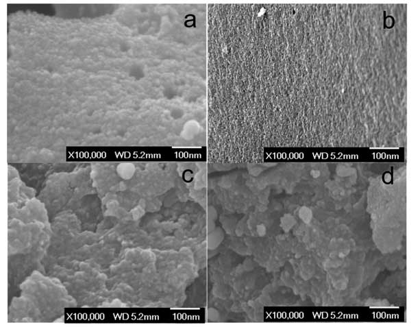 首先是電子顯微鏡,圖1顯示了活性炭(a),高溫活化后的活性炭(b),鎢浸漬活性炭(c)和鎢浸漬活性炭載鉑催化劑(d)的形態(tài)。SEM圖像(圖1a)顯示了在CO 2氣氛下在800℃下氣化的固體炭的形態(tài)。其多孔表面是由高溫下的CO 2蝕刻過程所貢獻(xiàn)的。高溫活化后的活性炭變得高度多孔,在1000°C碳化后,炭中形成了更多的孔和通道(圖2b)。鎢浸漬活性炭樣品中原始的活性炭結(jié)構(gòu)似乎消失了(圖1c),因?yàn)樵诟邷叵禄钚蕴亢脱趸u之間的碳熱還原反應(yīng)破壞了活性炭結(jié)構(gòu)。活性炭的壁表面嵌入了直徑在3到10 nm之間的納米粒子(圖1c),根據(jù)XRD結(jié)果,這意味著這些納米粒子應(yīng)為碳化鎢結(jié)構(gòu)。在鎢浸漬活性炭樣品中加入1.0%鉑后,表面形態(tài)無明顯變化(圖1d)。