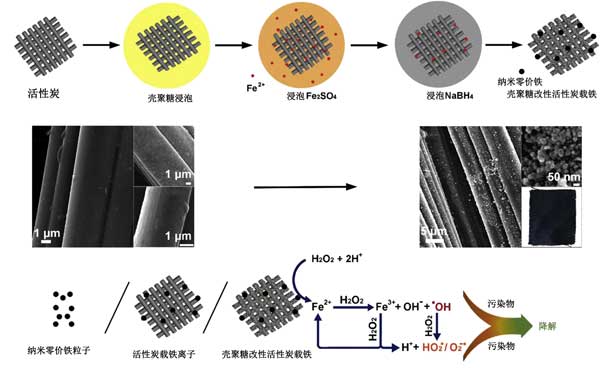 本次一共制備了三種類型的非均相Fenton催化劑,分別是納米零價(jià)鐵顆粒,活性炭負(fù)載的納米零價(jià)鐵和浸漬有納米零價(jià)鐵的殼聚糖改性活性炭。通過在活性炭上吸收鐵離子,然后使用NaBH 4原位還原,合成了活性炭負(fù)載的納米零價(jià)鐵。殼聚糖改性活性炭的制備方法是,先在酸洗過的活性炭上涂覆一層殼聚糖,然后將亞鐵離子螯合到殼聚糖基質(zhì)中,然后將其原位還原為納米零價(jià)鐵。這幾種活性炭催化劑的合成過程示意圖如圖1所示。