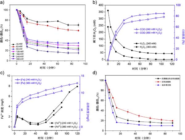 圖2:(a)活性炭處理的合成黑素廢水的脫色(C/C 0百分比),(b)在存在H2O的處理過程中,殘留H 2 O 2的濃度變化和活性炭的COD去除效率,(c)鐵離子的濃度變化和總鐵離子,(d)活性炭在相同載鐵量的條件下,三種催化劑在處理黑素廢水中的催化活性對(duì)脫色效果的比較。