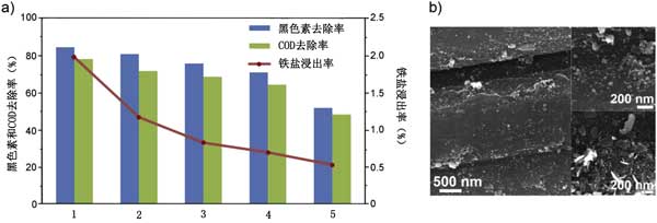 檢查了活性炭催化劑的可重復(fù)使用性,以評(píng)估其是否經(jīng)過了多個(gè)循環(huán)的黑色素處理。圖3顯示了五個(gè)處理周期的COD和脫色以及鐵浸出的結(jié)果。一個(gè)。盡管觀察到4個(gè)循環(huán)后,脫色效率從85%逐漸降低到70%,但是,可以證明活性炭催化劑在Fenton反應(yīng)中具有合理的可重復(fù)使用性。效率的降低可歸因于吸附降解副產(chǎn)物時(shí)某些催化劑位點(diǎn)的失活以及在Fenton反應(yīng)過程中少量鐵的浸出。在每個(gè)循環(huán)后對(duì)鐵的浸出進(jìn)行了研究,以表明活性炭的穩(wěn)定性。如圖3所示a,在第一個(gè)循環(huán)中浸出鐵離子的量最高,約為初始鐵量的2%。在第三個(gè)循環(huán)后,浸出鐵降至<1%,并且在隨后的循環(huán)中保持穩(wěn)定,在第五個(gè)循環(huán)時(shí)降至0.5%。與將鐵離子浸入溶液中的單獨(dú)的納米零價(jià)鐵相比,在Fenton類工藝中,亞鐵離子和鐵離子可能會(huì)被活性炭吸附/螯合,從而避免了浸出并使反應(yīng)連續(xù)供入。零碎的鐵損失顯然是活性炭催化劑再利用以及減少鐵淤渣的重要步驟。