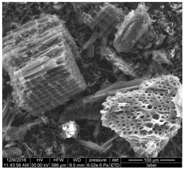 圖1:木質粉末活性炭的SEM。