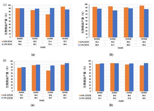 圖2:(1)在KOH存在下,從植物油中獲得的生物柴油的產率。(2)在KOH活性炭存在下,從植物油中獲得的生物柴油的產率。