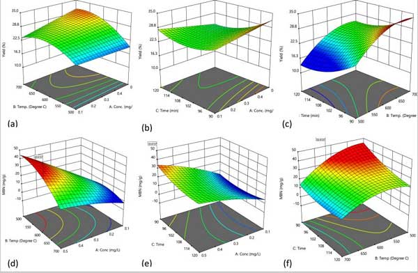 圖1:3-D圖顯示了(a、d)溫度和濃度(b、e)接觸時間以及濃度(c、f)接觸時間和溫度的相互作用對活性炭的百分收率和亞甲基藍數的影響。
