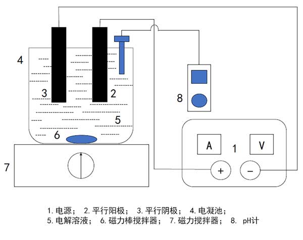 目前尚不知道電凝是否可以與活性炭吸附結合使用,作為從礦井廢水中去除硫酸鹽的可行新技術。所以我們來測試一下如圖1所示,使用有機玻璃反應器在720mL電凝電池(12×10×6cm)中進行活性炭吸附過程。鋁(純度≥99%)用作犧牲電極,不銹鋼用作陰極。每個電極板的有效面積為20cm2。平行的陽極和陰極垂直放置,并隔開一定距離。電極連接到數字直流電源,電壓和電流范圍分別為0-50V和0-5A。每次運行前,電極用細砂紙磨擦,先后用0.2M HCl和蒸餾水洗滌。對于每個實驗運行,將600mL礦井水放入電凝反應器中。使用磁力攪拌器不斷地(200rpm)攪拌溶液。將電流密度,電極間隙,初始pH和反應時間設置為期望值。通過添加0.1M HCl或0.1M NaOH來調節pH,并使用pH計進行測量。所有運行均在室溫(20°C)下進行。