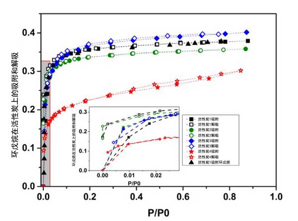 四種活性炭的吸附容量與它們的孔體積直接相關,較高的孔體積導致較高的吸附容量。微孔活性炭對環(huán)戊烷吸附等溫線的比較清楚地表明,即使可以預料到由于顆粒大小和孔體積,顆粒大小也不會顯著影響環(huán)戊烷吸附能力。