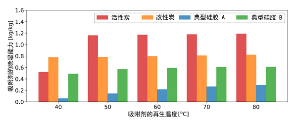 活性炭的除濕能力可以定義為在給定溫度和濕度條件下的有效吸附量,其計算方式為吸附與解吸之間的平衡吸附之差。考慮到實際環(huán)境條件,相當于室外空氣條件的吸附條件為干球溫度為32℃,相對濕度為80%。解吸條件是由再生空氣溫度從40℃到80℃給出的,室外空氣條件下的濕度比為24g/kg。計算出的除濕能力如圖1所示。比較了活性炭和典型硅膠(A型和B型硅膠)在不同再生溫度下的除濕能力。在硅膠的情況下,由于缺乏數據,吸附和解吸之間的磁滯被忽略了,并且預期它很小。