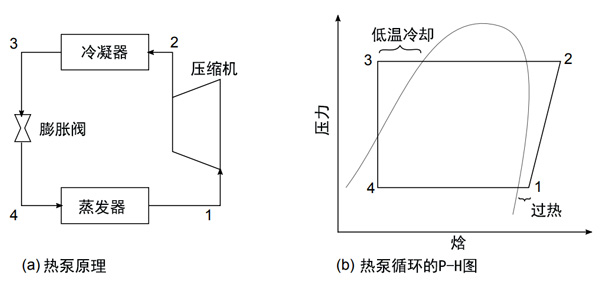 熱泵是空調的熱力學原理,可以基于狀態(tài)點的熱物理特性來預測熱泵的熱力學性能。圖2(a)顯示了典型熱泵的示意圖,圖2(b)顯示了壓力-焓線圖上的熱泵循環(huán)。在我們的模擬中,不僅計算了每種狀態(tài)下的熱物理性質,而且還計算了蒸發(fā)器和冷凝器中的熱交換過程。由于換熱器規(guī)格的可用性限制,所以將換熱器建模為雙管逆流式換熱器,該換熱器用于我們的實驗裝置中。
