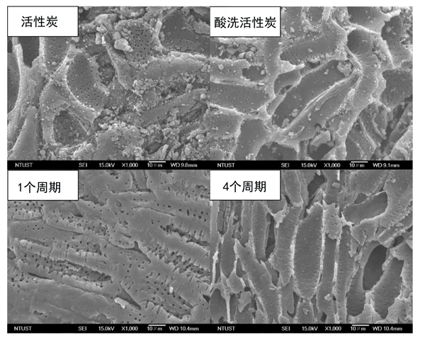 圖2:活性炭,酸洗活性炭和再生的活性炭在1000x放大倍數下的SEM圖像。